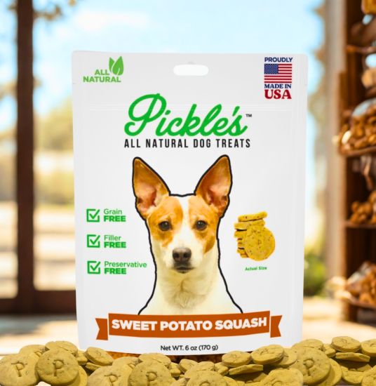 Inspired by our dog and made for yours, Pickle's Dog Treats are healthy, natural, human-grade, and limited in locally-sourced ingredients. Handmade by our family in Delta County, Texas, our premium treats mean one thing: premium pups. You will never find any byproducts, fillers, chemicals, or artificial preservatives in our products because quality is paramount to us. Our grain-free treats are crunchy, cookie-shaped, and always stamped with our signature letter 'P.' Safe for dogs of most sizes, breeds, ages, and/or dietary needs, Pickle's Dog Treats also come in multiple flavors, and are packaged in resealable, recyclable 6-oz. pouches.