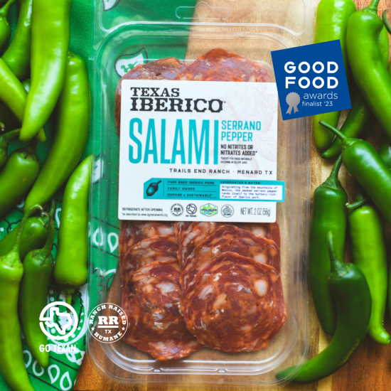 Hailing from Mexico, the serrano pepper finds its way into numerous authentic Mexican dishes and grows abundantly in the Texan landscape. The pepper’s warmth blends seamlessly with the sophisticated fat and intricate flavor profile of Iberico pork. Our 100% Iberico Pork Salami is made with smoked serrano peppers and then dry cured for 45 days.